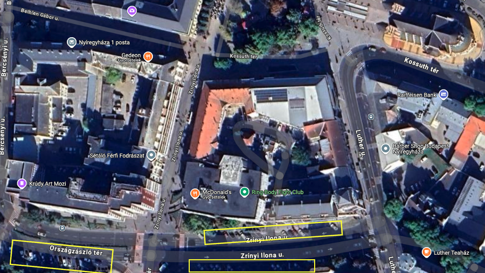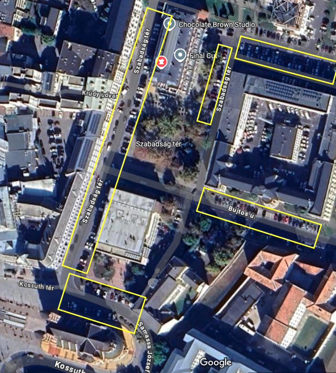 A sárgával megjelölt utcákban tudtok parkolni a szabad helyek függvényében: Szabadság tér, Bujtos u., Országzászló tér, Zrínyi Ilona u.